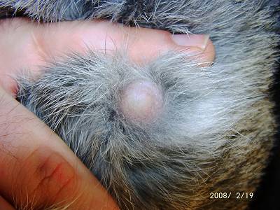 Karoline verhielt sich vor dem Feststellen einer Zitzenzyste (bzw. Mammazyste) völlig unauffällig und normal und fraß auch ganz gewöhnlich wie vorher. Wir stellten die Zitzenzyste beim Umfassen und Hochheben von Karoline fest. Eine Zitzenzyste kann u. U. sehr plötzlich auftreten, und genau aus diesem Grund ist es wichtig, dass man dann natürlich so schnell wie möglich einen Tierarzt für Kleintiere aufsucht sobald man es eben bemerkt, denn unbehandelt können schwerwiegende Entzündungen oder Abszesse hinzukommen die aufwändig behandelt werden müssen und soweit sollte man es keinesfalls erst kommen lassen. Wenn Sie also einen Knubbel, wie im folgenden Bild dargestellt, an einer oder mehrerer Zysten bemerken, dann ist unausweichlich guten tierärztlichen Rat einzuholen.